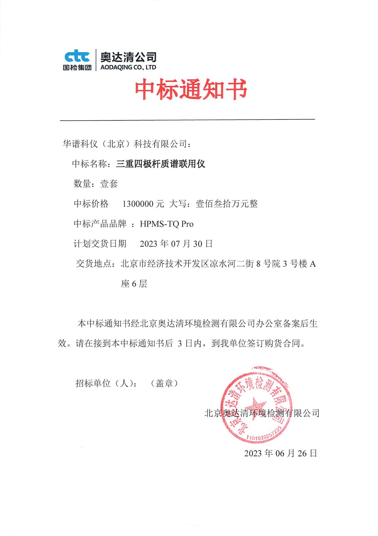 北京奥达清环境检测有限公司三重四极杆质谱联用仪中标结果公告